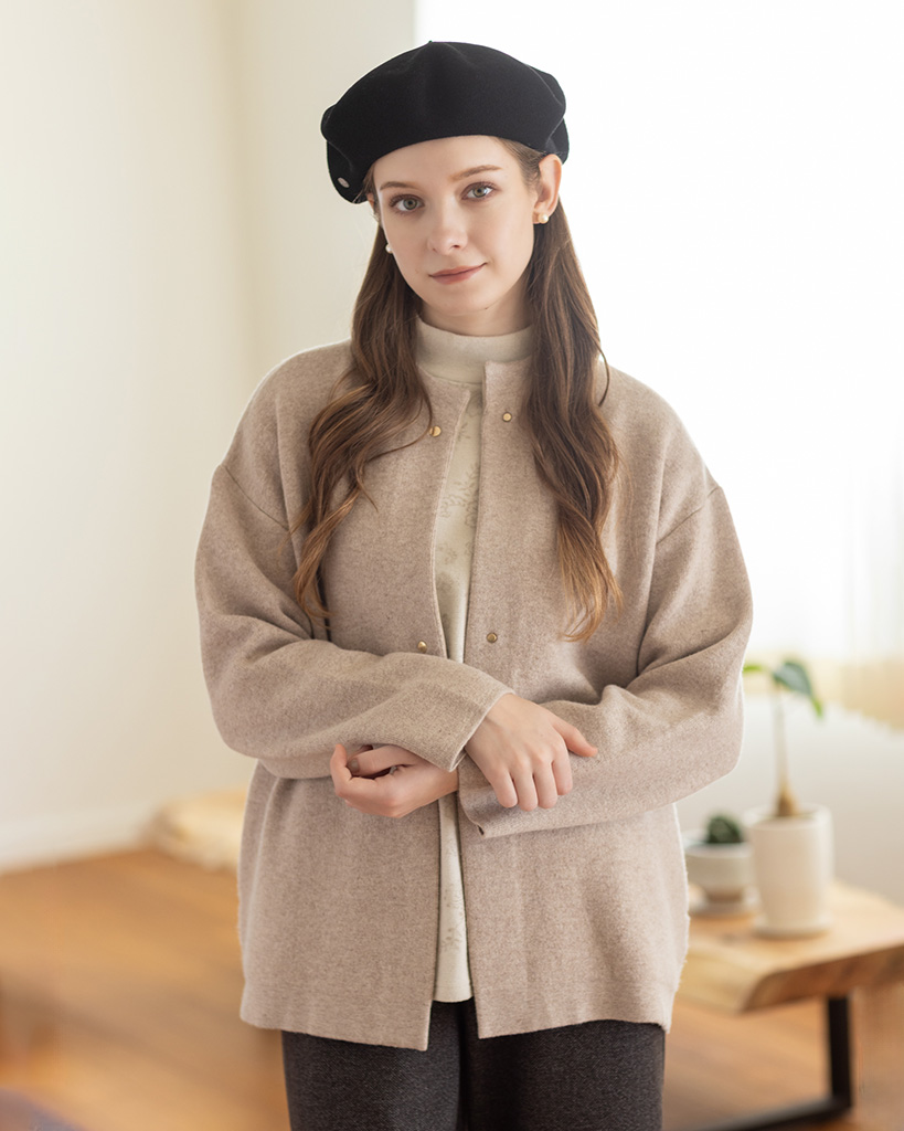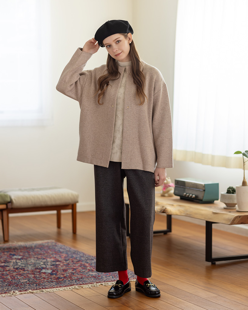 肌触りのよいニット素材をジャケット仕立てにした軽くて暖かなウール混Wフェイスニットジャケットです。