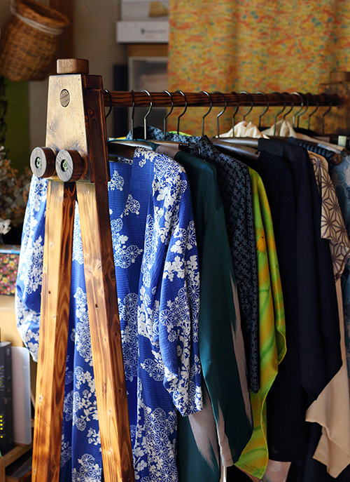 両袖をはずした状態だった男物の長襦袢にゴムを通し、カシュクール風のジャンパースカートにアレンジ。櫻井さんのデザインは、着物の上品さを残しつつ、普段づかいできる軽やかさが魅力。龍、鹿、鯛、鶴、コウモリなど、不老長寿や幸福を象徴した縁起のいい柄も、普段の暮らしにすっと馴染みます。