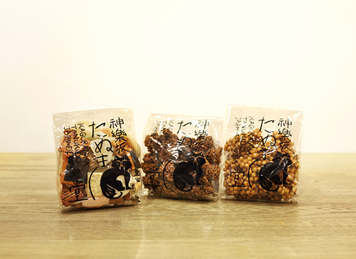 数ある商品のなかでもとくに人気なのが「神楽坂たぬき堂」の米菓。神楽坂プリュスのオリジナルブランドで、腹が白い(腹黒くない)たぬきのように正直に、他を抜く(たぬき)美味しさを追求しています。おしゃれなパッケージで手土産や贈り物にもおすすめです。