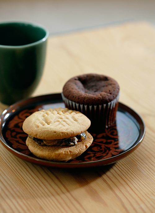 上質で安心、安全な素材を使った Moiira のお菓子。グルテンフリーのラムレーズンサンドは、米粉のほろほろクッキーに、ラム酒に漬け込んだ有機レーズンを加えたバタークリームをサンド。カカオ 61%の有機チョコレートを使用したチョコレートケーキは、カカオの香りとほんのりビターな味わいが楽しめます。