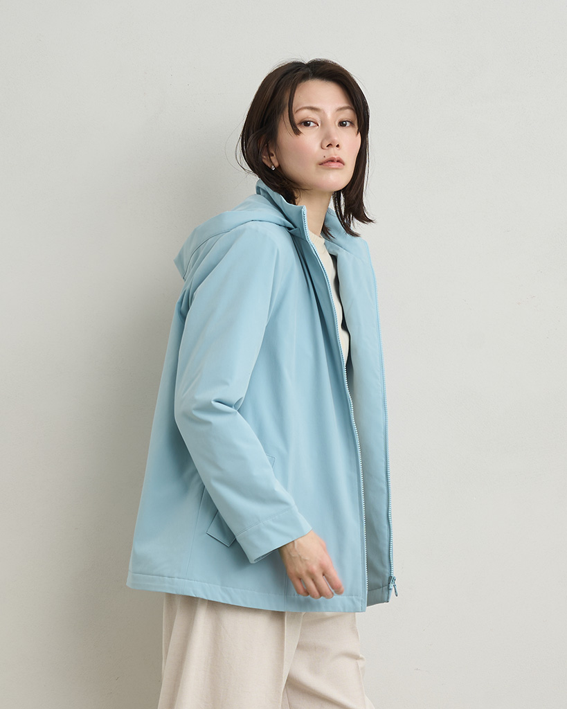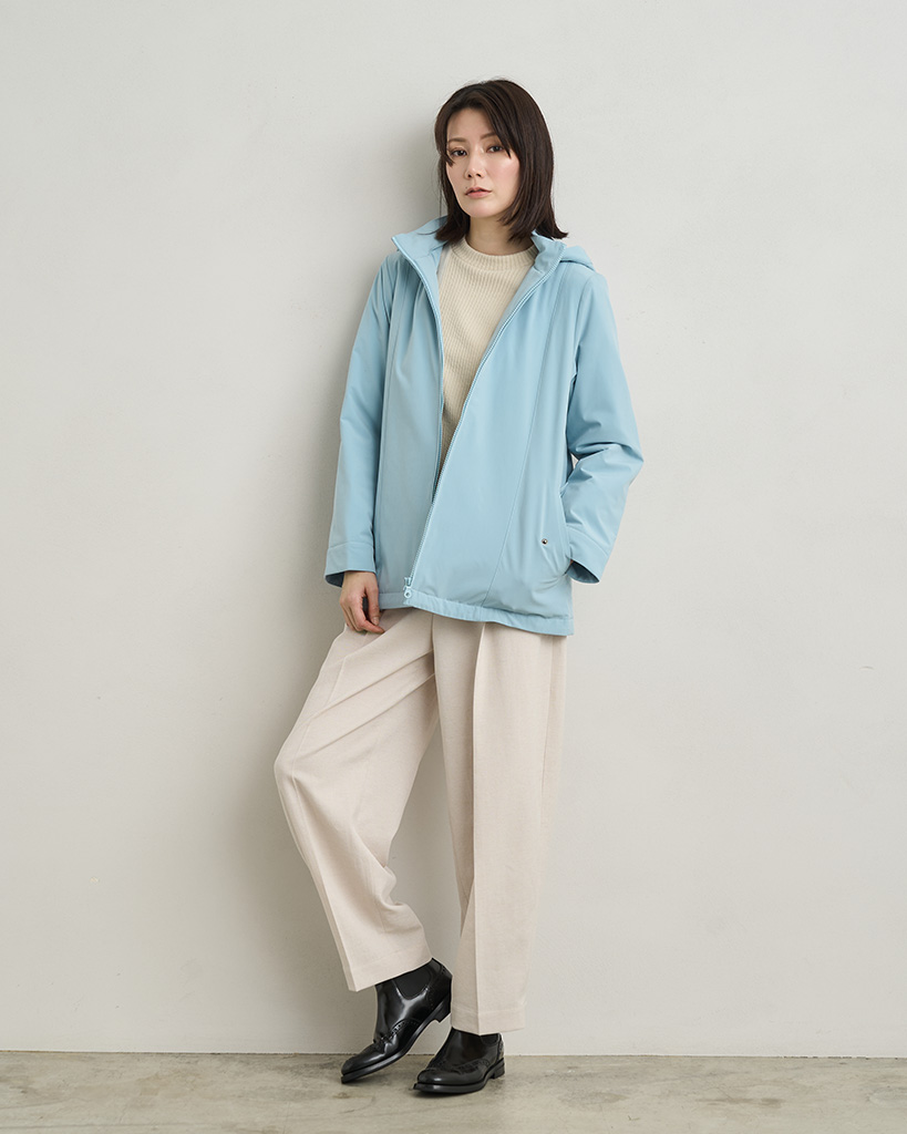 フードを外してスタンドカラー使いできれいめな着こなしもおすすめの2WAYデザインです。